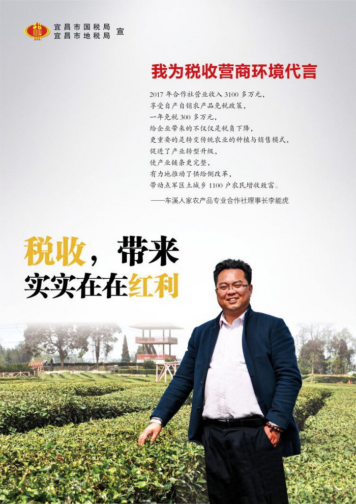 宜昌市国税局、地税局借鉴“明星海报”形式,开展“打CALL新时代•点赞新税貌”大众海报“我为税收代言”活动。请纳税人、精准扶贫对象、政府官员、学生当“税收营商环境代言人”,制作艺术性和专业性高清晰原图印制海报,晒营改增、小微企业、高新技术企业减税账本,谈税收促进化工产业转型升级、外向型经济发,赞国税地税合并的好处,议便民办税春风行动、“放管服”改革等举措带来的新变化,说驻村扶贫工作队帮扶实效等等,受到社会热捧。